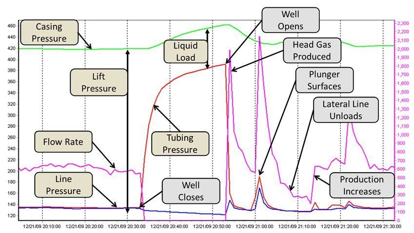 Using this data, operators optimize plunger cycles and trace plunger arrival anomalies to probably causes. As an example, a missed arrival in which lift pressure and liquid load generate consistent plunger arrivals on all previous runs indicate an arrival sensor failure, damaged or stuck plunger. Adjusting the plunger cycle will not resolve these issues.