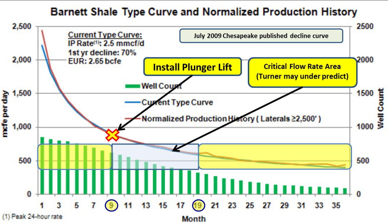 Applying this approach (Fig 5) suggests installing plunger lift on qualified Barnett Shale wells about nine months after initial production.