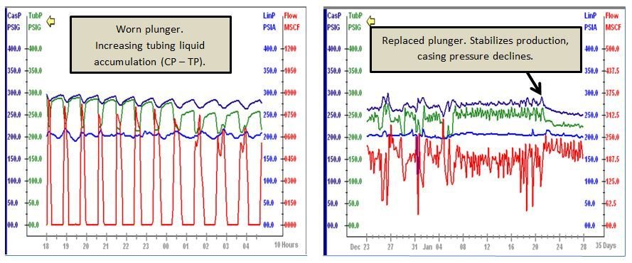 Yet when implemented, this is the most effective approach, reducing opportunity for errors and limiting down time. A controller that notifies operators to replace worn plunger is a helpful tool! Replacing plungers in wells prior to production decline is a small price to pay relative to the alternative high cost of lost production (See Fig 2) and/or swabbing.